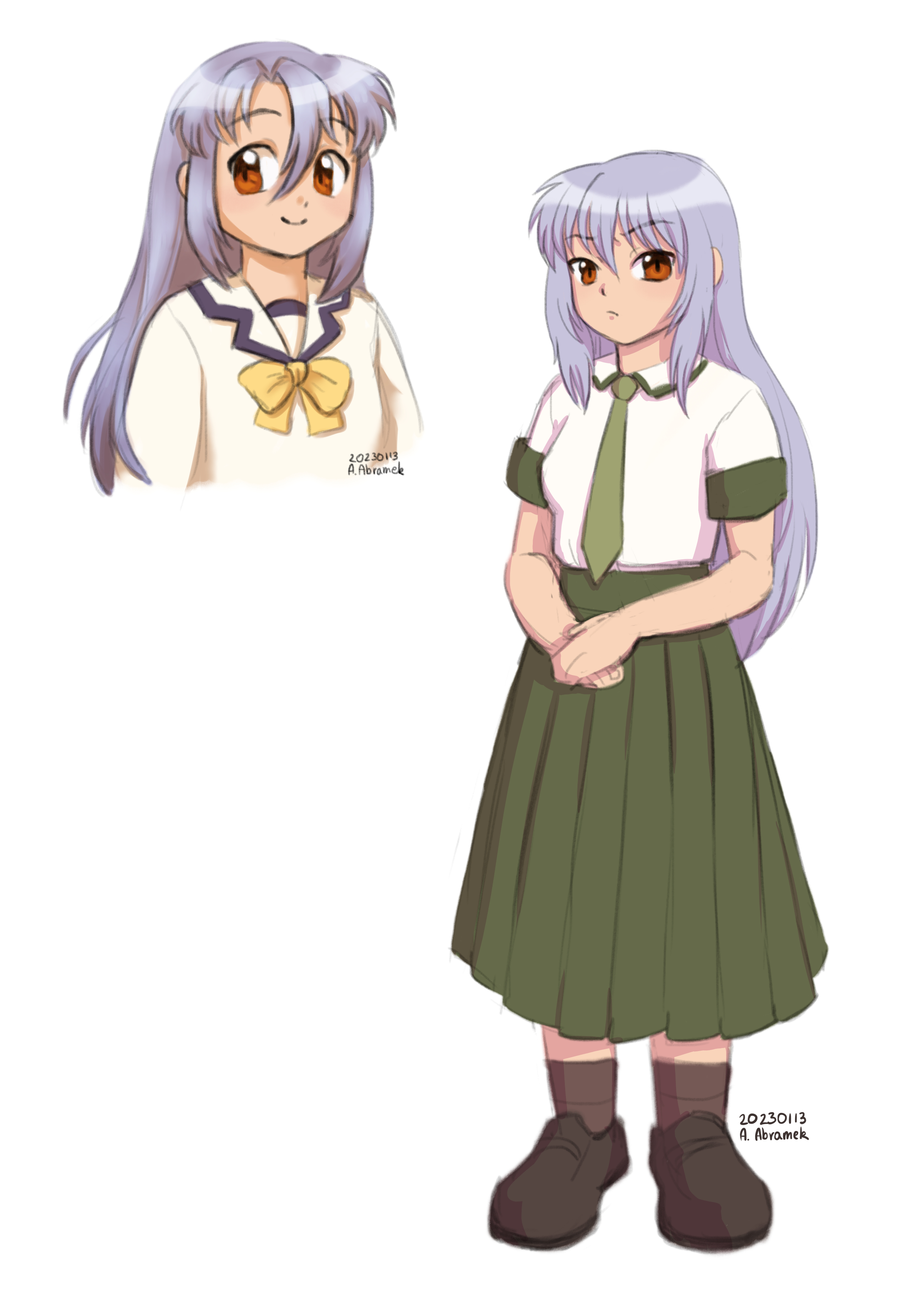 I also did a few sketches of Ayame, she was my firest ever OC that I made when I was 13. I always drew her in cargo pants and t-shirts, so I wanted to explore some other outfits ^^ Here are: primary school uniform (and hair cut by herself), high-school uniform, winter outfit, pajamas, and hair tied up~