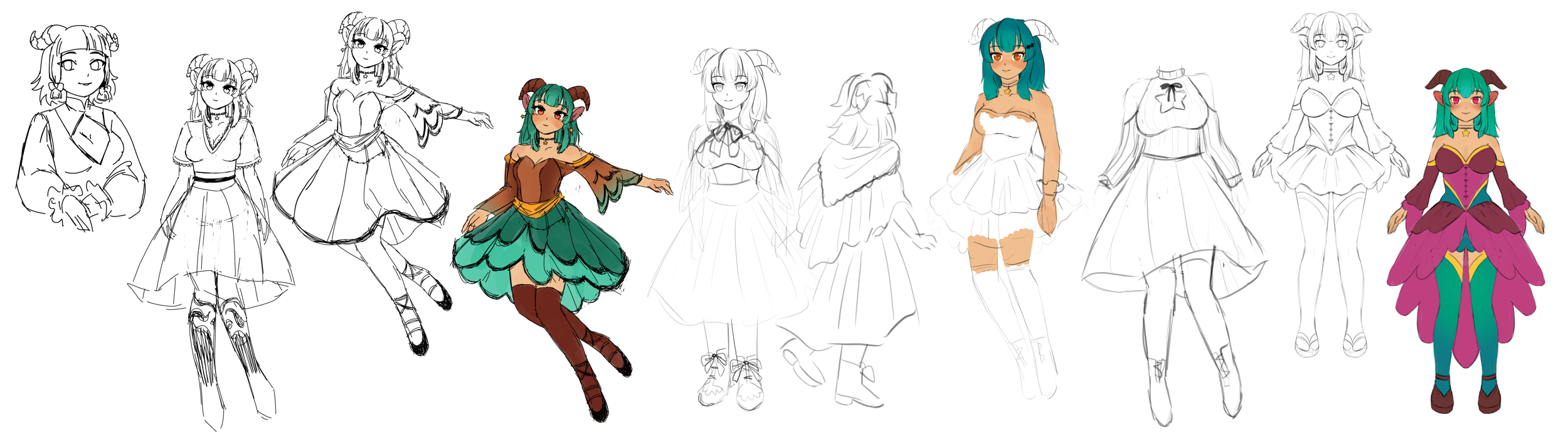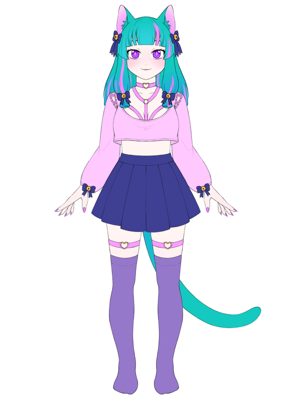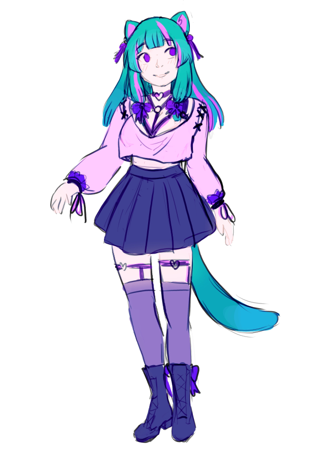 The other one is a catgirl, I made her just so I can draw some fun clothes ^-^ Here is the first colour sketch vs finished design