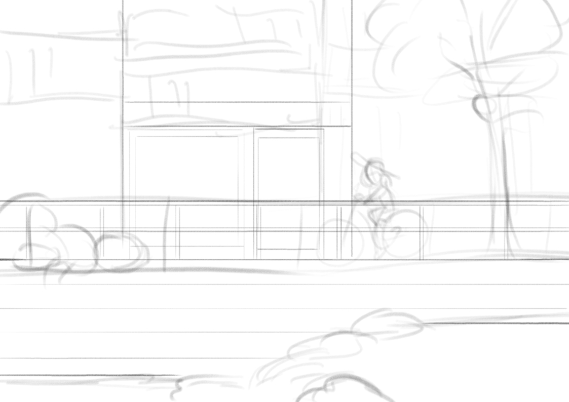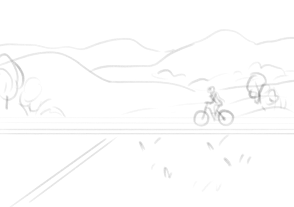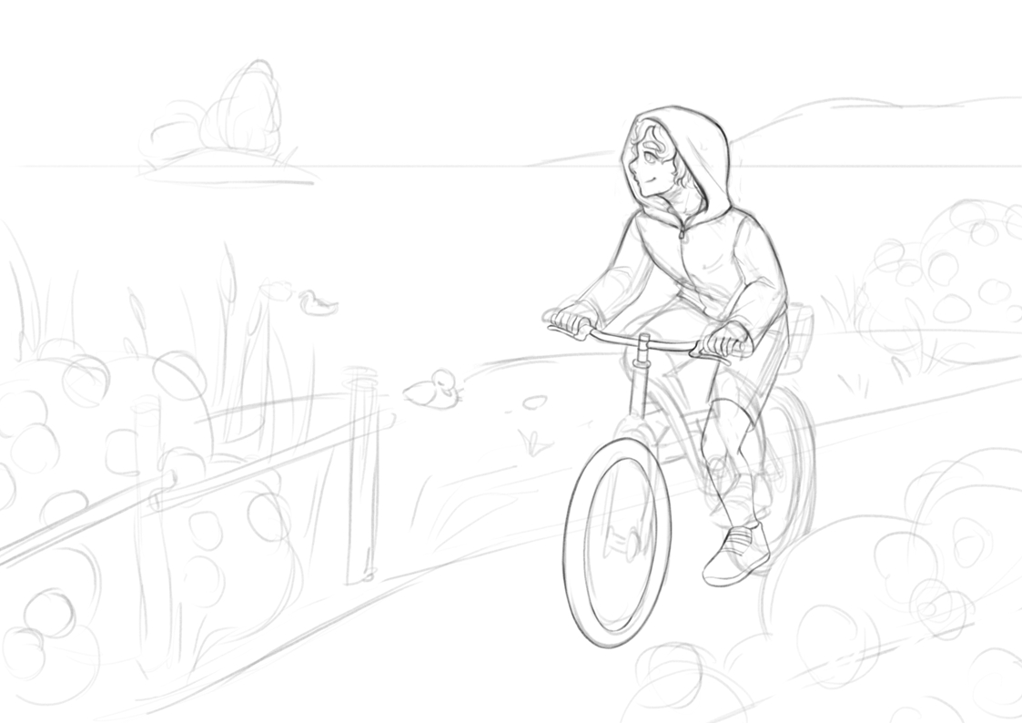 Here are some sketches/WIPs. First I tried to put the bike rider in a ‘background focused’ scene: