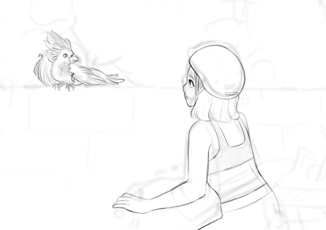 The bird in the bushes is Raróg (a fire demon from slavic mythology). I like the concept of putting a slavic creature in modern setting but this sketch just feels off.