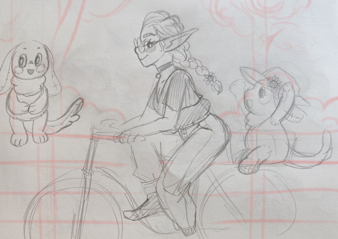At some point I was sketching with a pencil in my sketchbook and after drawing other stuff I spontaneously decided to draw a goblin on a bike. And I really liked the sketch (finally!) so I edited in on my tablet and worked from there.